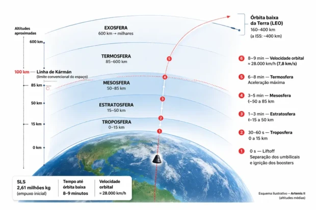 Na ida, a SLS saiu da troposfera em poucos minutos, cruzou à estratosfera em aproximadamente 50km acelerou até a termosfera. Quando passou a linha de Kármán, em cerca de 100 km, continuou acelerando até a órbita baixa da terra. Para chegar à velocidade orbital, mais ou menos 28 mil km/h, foram cerca de 8 a 9 minutos.
