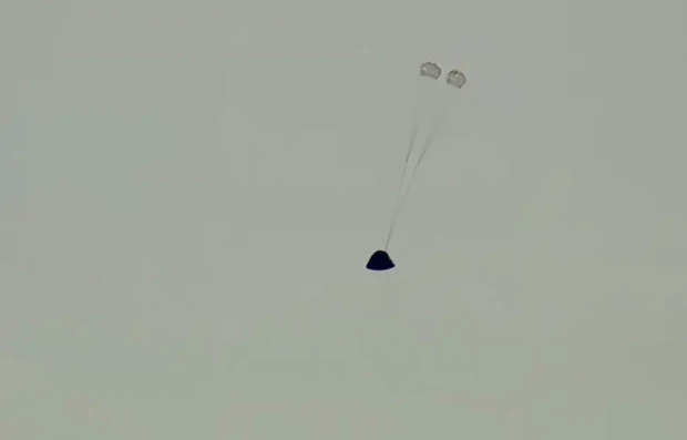 A descida final exigiu a abertura de várias camadas de paraquedas para reduzir a velocidade de Mach 33 para apenas 19 mph. A 5.000 pés, os três enormes paraquedas principais (cada um com 116 pés de diâmetro) foram inflados.