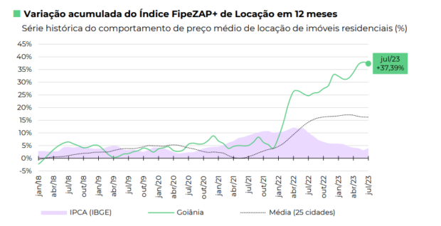 Goiânia registrou o maior aumento do preço do aluguel residencial dos últimos 12 meses até julho, aponta o ranking FipeZap+. De acordo com o levantamento, os preços na capital goiana subiram 37,39% no período. Florianópolis e Curitiba vêm logo em seguida. Essas tiveram alta de 36,10% e 21,33%, respectivamente. O Rio de Janeiro ficou em quarto lugar, com 19,80%, e São Paulo em 10º, com 14,03% de aumento.
