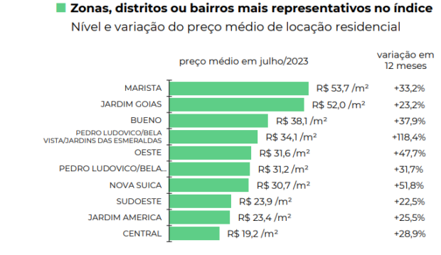 De acordo com a pesquisa da FipeZap, o setor Marista tem o metro quadrado mais caro da cidade, com uma média de R$ 53,7/m², seguido do Jardim Goiás, com R$ 52/m² e Setor Bueno, onde o custo do m² é de R$ 38,1.