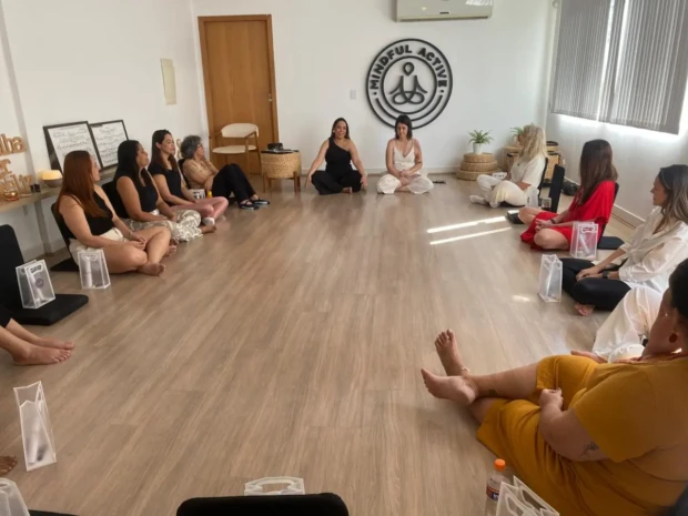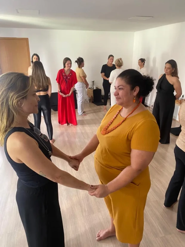 Na sala de meditação, íamos nos aquietando, respirando e sendo conduzidas pelas terapeutas. Foram oito horas de vivência, presença e expressão. Houve diversos comandos e práticas para redução da ansiedade, liberação de bloqueios energéticos relacionados à libido, aumento da autoconfiança, melhora da relação com o próprio corpo e fortalecimento do pertencimento por meio da energia feminina em grupo.
