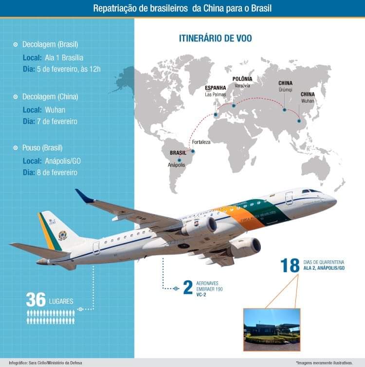 As duas aeronaves da FAB fazem escala em Fortaleza, Las Palmas (Espanha), Varsóvia (Polônia) e Urumqi (China) e devem chegar a Wuhan na próxima sexta-feira, 7. A previsão inicial de regresso das aeronaves sábado, 8.