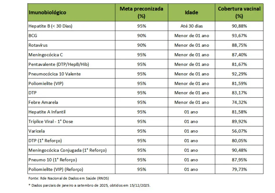 A vacinação infantil é uma etapa fundamental para o desenvolvimento saudável de todas as crianças. Em Goiás, os dados mais recentes da Secretaria Estadual de Saúde revelam que nenhuma das oito vacinas obrigatórias para crianças de até 5 anos atingiu cobertura total em 2025, embora alguns índices estejam próximos ou acima das metas estabelecidas pelo Ministério da Saúde.