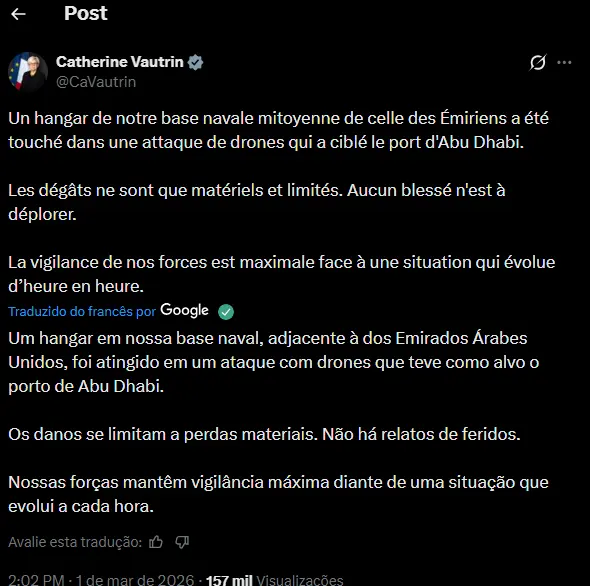 Segundo a ministra das Forças Armadas francesas, Catherine Vautrin, em publicação no X, um hangar da base naval da França “foi atingido em um ataque de drone que teve como alvo o porto de Abu Dhabi”. Segundo ela, “os danos são apenas materiais e limitados”.