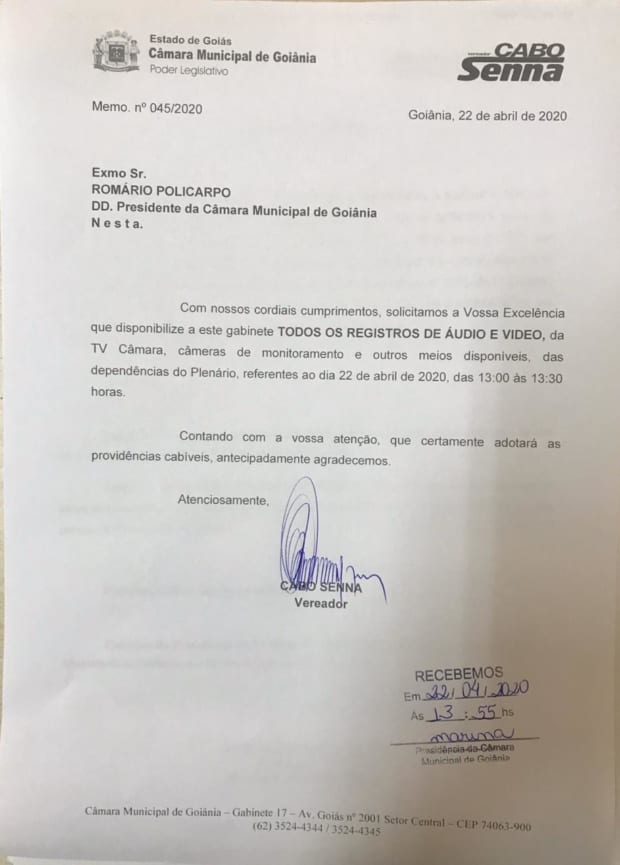 Depois do ocorrido, o vereador Cabo Senna decidiu solicitar as imagens registradas pela TV Câmara e câmeras de segurança e vídeo monitoramento do plenário. O intuito é checar a veracidade das afirmações de Clécio Alves que afirmou ter visto o filho sendo conduzido de maneira abrupta pelas autoridades. O pedido foi formalizado e encaminhado ao presidente do Parlamento. Veja: