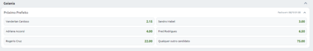 Uma casa de apostas divulgou as odds, índice que indica a chance o candidato ganhar o pleito, para a eleição à Prefeitura de Goiânia. Caso queira apostar no pleito, a menor odd é de Vanderlan Cardoso (2.15), seguido por Sandro Mabel (3.00) e Adriana Accorsi (4.00).