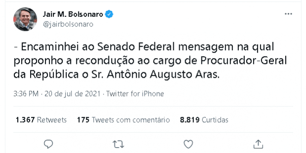 “Encaminhei ao Senado Federal mensagem na qual proponho a recondução ao cargo de Procurador-Geral da República o Sr. Antônio Augusto Aras.”