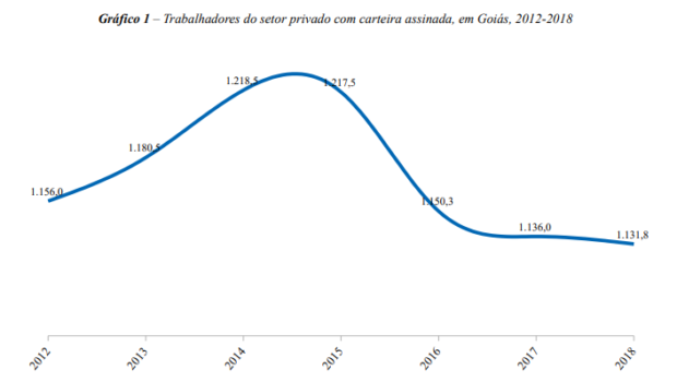 De acordo com estudo divulgado pelo Instituto Brasileiro de Geografia e Estatística (IBGE) o número de empregados com carteira assinada no Estado diminuiu. O índice é o menor da série histórica de Goiás. Os números mostram que o melhor resultado foi atingido ainda no ano de 2015, com 1.218 mil trabalhadores registrados. De lá para cá o índice despencou chegando a 1.132 em 2018. Veja o gráfico:
