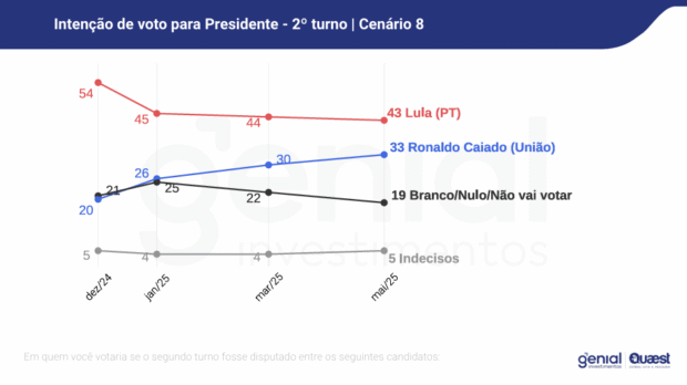 Lula teria vantagem de 2 pontos percentuais contra Ratinho (40% a 38%), de 4 pontos contra Michelle (43% a 39%) e Eduardo Leite (40% a 36%), de 9 contra Zema, de 10 contra Eduardo Bolsonaro e Caiado. O percentual dos que disseram que votariam em branco ou não iriam votar varia de 13% a 19%.