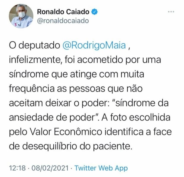 O governador Ronaldo Caiado (DEM), usou o Twitter nesta segunda-feira, 8, para reagir à entrevista de Rodrigo Maia ao Valor Econômico. O democrata disse na publicação que o ex-presidente da Câmara dos Deputados foi atingindo pela “síndrome da ansiedade de poder”.
