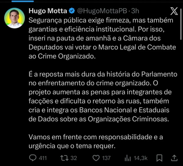 Em publicação nas redes sociais, Motta destacou que a votação representa um marco no enfrentamento às organizações criminosas. “Segurança pública exige firmeza, mas também garantias e eficiência institucional”, escreveu. Segundo ele, a aprovação do projeto será “a resposta mais dura da história do Parlamento contra o crime organizado”.