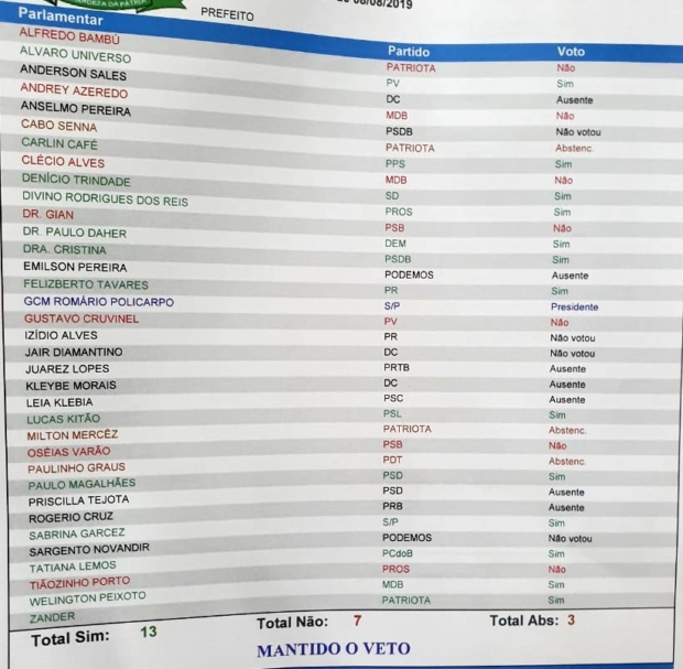Diante das acusações de Urias, o vereador Paulo Magalhães se limitou a dizer: “Eu não sei onde está a cabeça de quem pensa dessa forma”. Veja como votou cada um dos parlamentares da Câmara: