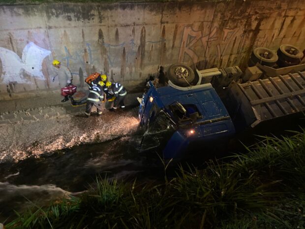 Caminhão cai em vala da Marginal Botafogo durante chuva