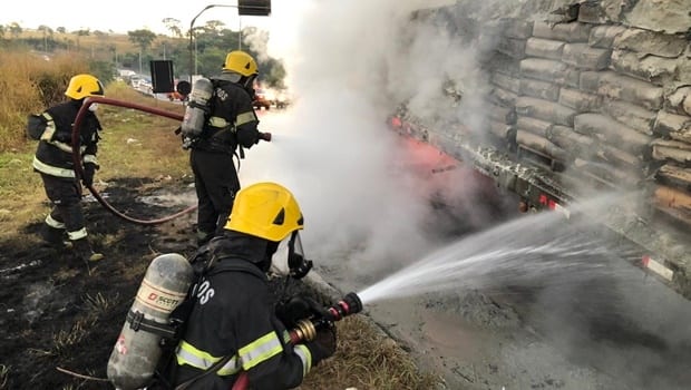 As chamas chegaram a atingir os pneus da carreta. O Corpo de Bombeiros enviou quatro viaturas e gastou aproximadamente 2 mil litros de água para combater as labaredas.