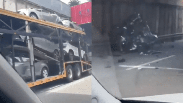 Carros são destruídos após caminhão cegonha entalar em viaduto de Anápolis