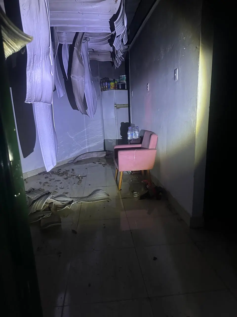 Apesar disso, a alta temperatura provocou danos significativos por convecção, comprometendo cerca de 90% do forro de PVC da casa. A água espalhou-se por todos os cômodos, alagando o imóvel.