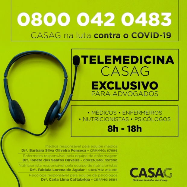 Por conta da pandemia do novo coronavírus, a Caixa de Assistência dos Advogados de Goiás (Casag) passou a disponibilizar o serviço de telemedicina aos seus inscritos. “Neste momento tão deliciado é fundamental este amparo. Não apenas direcionado à advocacia, mas por extensão às suas famílias”, afirma o presidente da Casag, Rodolfo Otávio Mota.