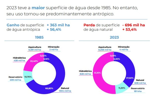 O levantamento explica que, comparando o ano de 2023 com o cenário de 1985, a superfície de água do Cerrado ligada à ação humana (hidrelétricas e reservatórios, por exemplo), teve ganho de 363 mil hectares, enquanto a superfície de água natural perdeu 696 mil hectares. Dessa forma, áreas de vegetação nativa e comunidades tradicionais perdem espaço para os grandes centros urbanos e para a produção agropecuária extensiva.