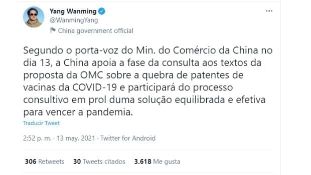 Em sua conta no Twitter, o embaixador da China no Brasil, Yang Wanming disse nesta semana que o país asiático apoia a consulta à proposta da Organização Mundial do Comércio (OMC) de quebra de patentes de vacinas contra a Covid-19. Ele afirmou que um porta-voz do Ministério do Comércio da China “participará do processo consultivo em prol duma solução equilibrada e efetiva para vencer a pandemia”, tuitou. Veja o tweet na íntegra: