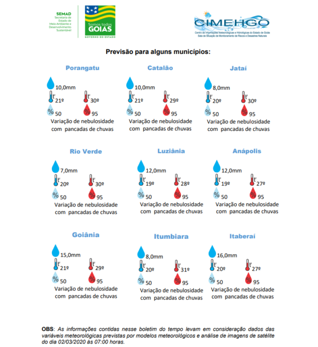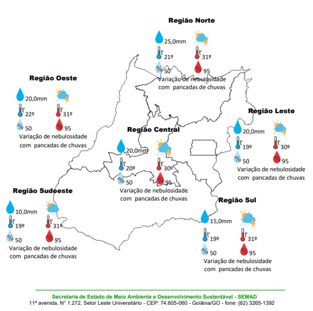 A Secretaria de Meio Ambiente e Desenvolvimento Sustentável (Semad), por meio do Centro de Informações Meteorológicas e Hidrológicas do Estado de Goiás (Cimehgo) divulgou um boletim de alerta para pancadas de chuvas nesta segunda-feira, 2.