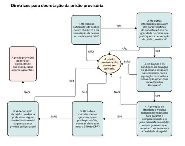 Um dos pontos destacados no documento aborda as prisões provisórias. Veja abaixo um quadro elaborado voltado para atuação dos agentes de Justiça no momento da decretação ou não desse tipo de prisão: