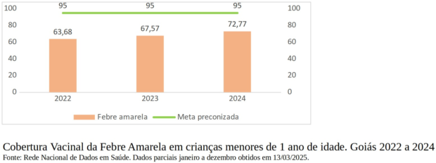 A vacina contra a febre amarela é uma das prioridades da saúde pública em Goiás, especialmente entre crianças menores de 1 ano. Apesar de não haver registros de casos da doença no estado desde 2017, a cobertura vacinal dessa faixa etária está abaixo da meta estipulada, com apenas 72,77% das crianças vacinadas.
