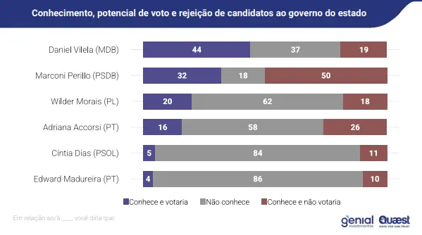 Na sequência, a deputada federal Adriana Accorsi (PT) registra 26% de rejeição. O vice-governador Daniel Vilela (MDB), que lidera as intenções de voto, apresenta um índice menor, de 19%, enquanto o senador Wilder Morais (PL) soma 18%.