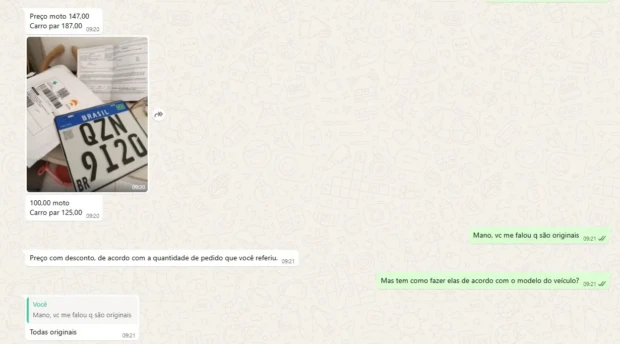 O criminoso chega a dar um desconto devido a quantidade de placas que a reportagem informou ter interesse: 50, sendo 30 de motos e 20 de carros. Neste “pacote”, o valor cairia R$ 100 (moto) e R$ 125 (carro). O documento, porém, permaneceria o mesmo valor.