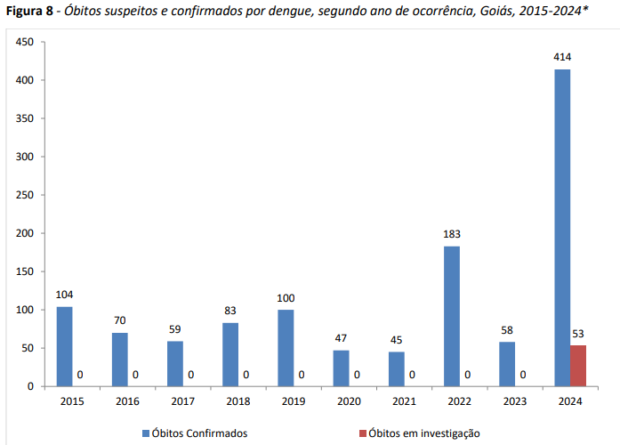 Conforme o último Boletim Epidemiológico das Arboviroses da Secretaria de Estado da Saúde de Goiás (SES), produzido pela Gerência de Vigilância Epidemiológica, foram confirmados 414 óbitos por dengue de janeiro a dezembro deste ano, com outros 53 ainda estão em investigação. Em 2023, foram confirmados apenas 58 óbitos. O ano de 2024, portanto, conforme apontado para SES, está se consolidando como o período de maior impacto da dengue na história de Goiás.