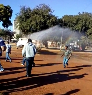 Durante manifestação, caminhão pipa da prefeitura jogou água nos trabalhadores que revidaram com pedra