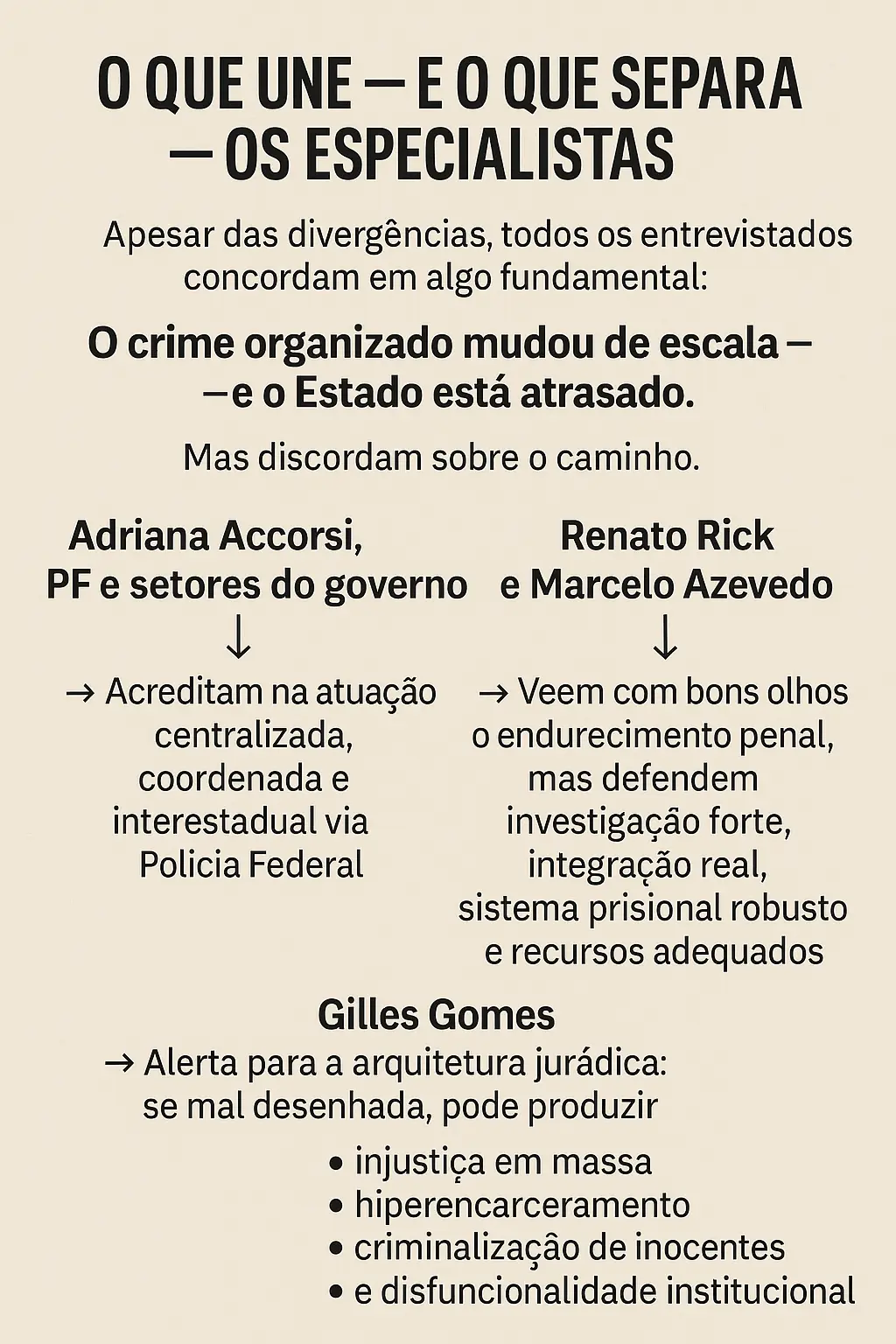 Accorsi acredita que o Senado vai restabelecer o texto original do governo. É uma aposta — e talvez um último fio de esperança — de que o país não consolide um modelo que, em sua avaliação, fortalece a política e enfraquece as instituições que realmente enfrentam as facções.