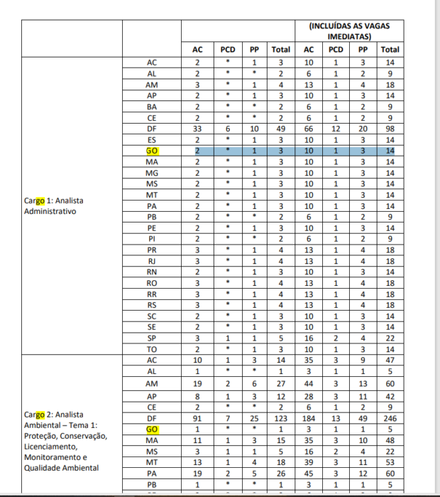 Para o cargo de analista administrativo foram disponibilizadas duas vagas de ampla concorrência e uma para pretos e pardos. Além disso, há 14 de vagas imediatas, sendo 10 de ampla concorrência, 1 para PCD e três para pretos e pardos. Já para o cargo de Analista Ambiental foi foram reservadas 6 vagas no total, sendo cinco de início imediato.