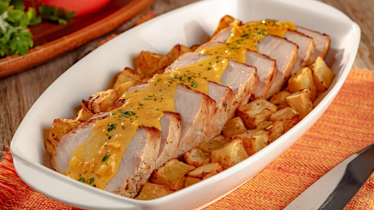 Tempere o lombo com sal, pimenta, alho e limão. Misture mel, mostarda e azeite, espalhe sobre a carne e cubra com papel-alumínio. Asse por 1h30 a 180 °C. Em seguida, retire o papel e deixe dourar por mais 20 a 30 minutos.
