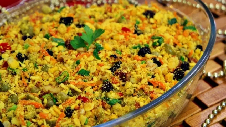 Derreta a manteiga e refogue a cebola. Acrescente milho, uvas-passas e castanhas. Depois, adicione a farinha e ajuste o sal, mexendo até a farofa ficar bem soltinha.