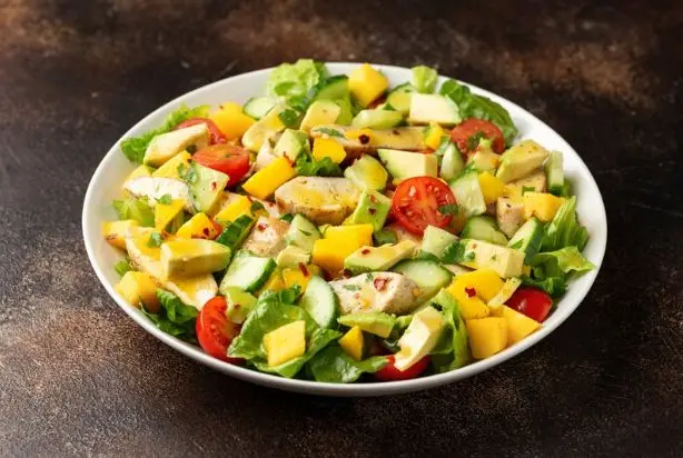 Monte a salada com as folhas, manga, romã e nozes. Prepare um molho com azeite, sal, limão e um fio de mel, regando tudo na hora de servir.