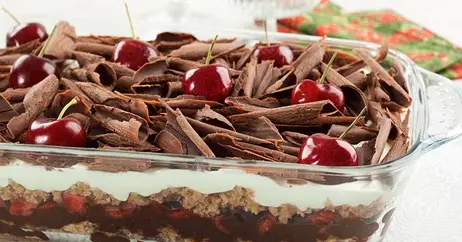 Misture leite, amido, leite condensado e chocolate. Leve ao fogo até engrossar. Depois, espere amornar e acrescente o creme de leite. Monte camadas de creme, cerejas e biscoitos. Finalize com chocolate ralado e leve à geladeira por três horas.