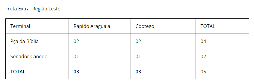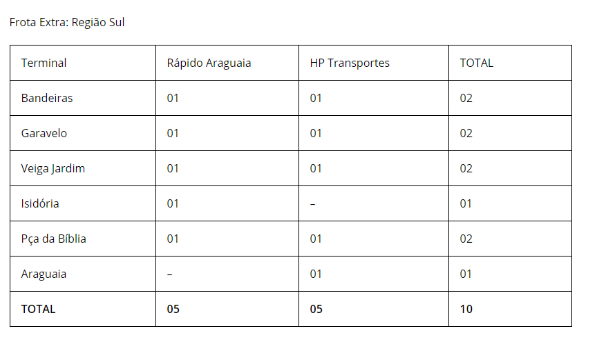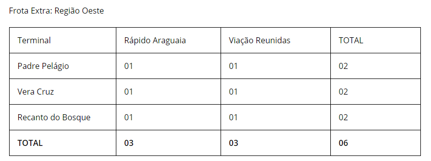 338 – T. Vera Cruz / Rodovia GO – 060 / Jd. do Cerrado I – Quantidade de viagens aos Domingos:14 viagens;