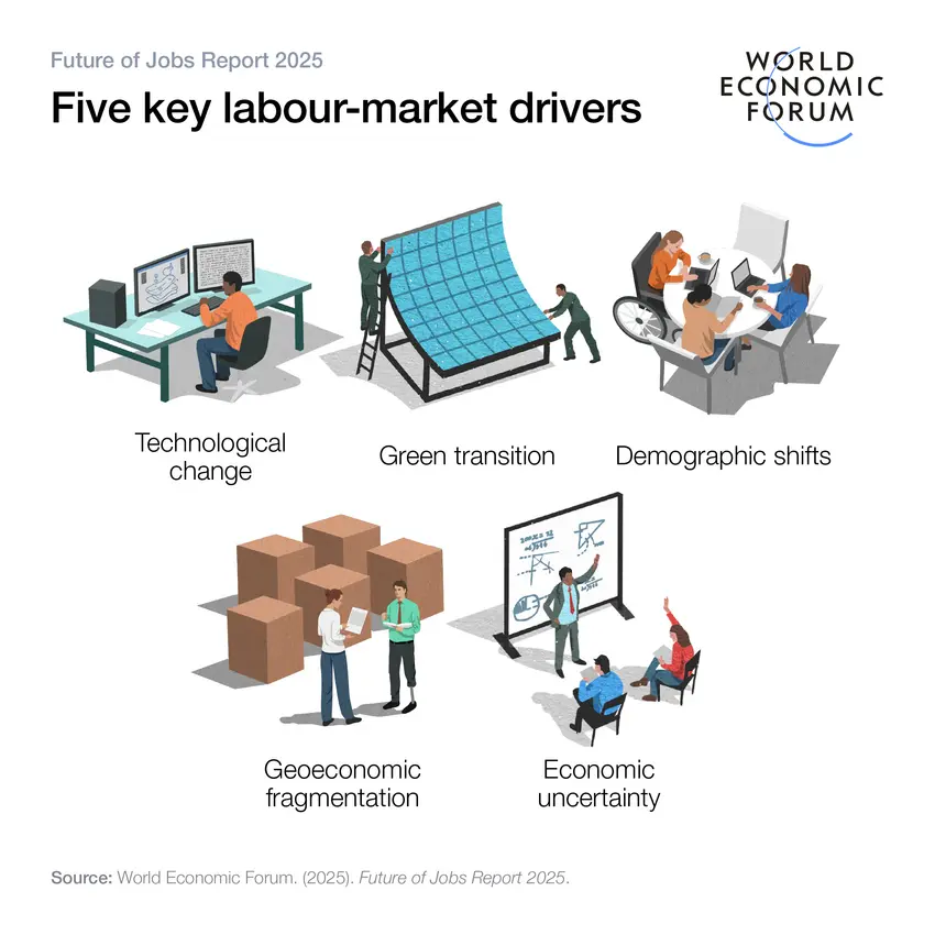 O Relatório Futuro dos Empregos 2025, lançado pelo Fórum Econômico Mundial (WEF) projeta que, até 2030, 170 milhões de novos empregos serão criados globalmente, enquanto 92 milhões serão deslocados, deixando um ganho líquido de 78 milhões de empregos.