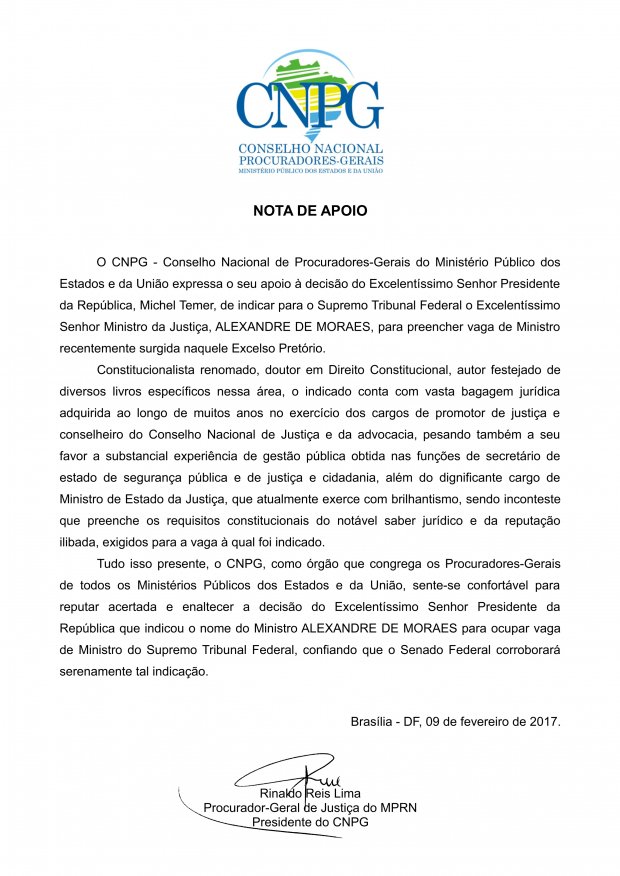 Em nota assinada pelo Rinaldo Reis Lima Procurador-Geral de Justiça do MPRN e presidente do CNPG, o conselho afirma que o Moraes tem “vasta bagagem jurídica adquirida ao longo de muitos anos no exercício dos cargos de promotor de justiça e conselheiro do Conselho Nacional de Justiça”, e elogia ainda sua atuação à frente do Ministério da Justiça. Segundo o conselho, Moraes “exerce o cargo com brilhantismo”.