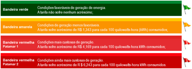 O sistema de bandeiras tarifárias sinaliza o custo real da energia gerada. O funcionamento das bandeiras tarifárias funciona do seguinte modo: as cores verde, amarela ou vermelha (nos patamares 1 e 2) indicam se a energia custará mais ou menos em função das condições de geração.