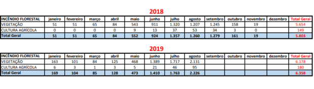 De acordo com informações do Corpo de Bombeiros Militar de Goiás (CBMGO), o número de incêndios florestais deste ano já superou os focos registrados ao longo do ano de 2018. Ao todo, foram 5.803 no ano passado. Este ano, de janeiro a agosto o número chega a 6.358.