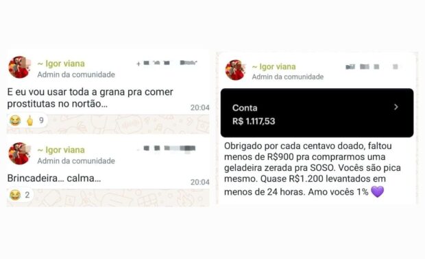 Igor, por outro lado, chamou os doadores de “trouxas” e chegou a confirmar os desvios por meio de áudios e mensagens de texto cedidas à reportagem pela delegada. No arquivo sonoro, ele diz que “também tem necessidades” e que a criança é “chata” e “dá muito trabalho”. Em um print de uma comunidade, ele fala que iria “usar toda a grana para comer prostitutas no nortão”.