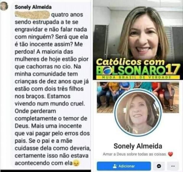 Pelas redes sociais, Sonely Almeida insinua culpa da menina de 10 anos pelos 4 anos de estupro. “Será que ela é tão inocente assim? Me perdoa! A maioria das mulheres de hoje estão pior que cachorras no cio”, disse em comentário no Facebook