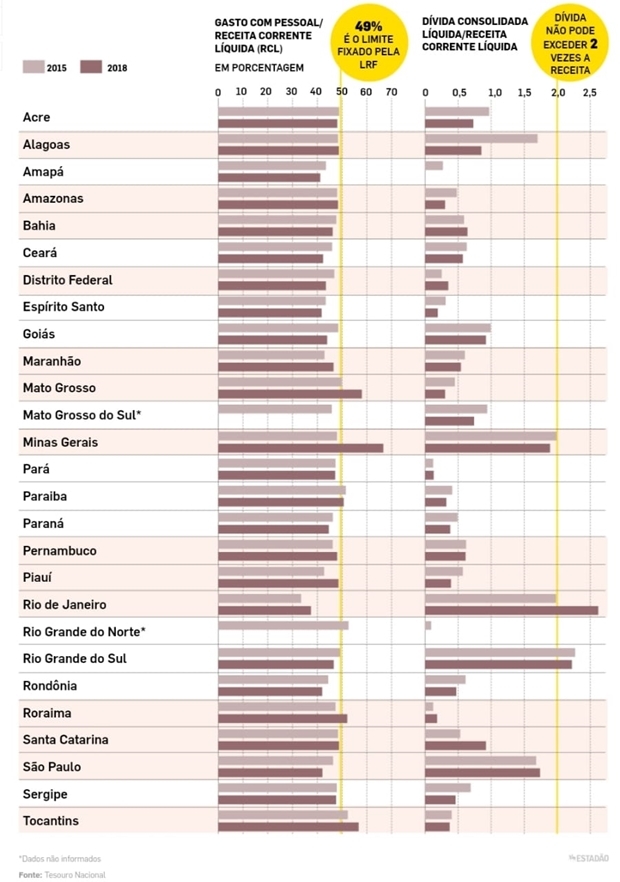 Em 2016, o governo federal suspendeu o pagamento e reduziu parcelas das dívidas estaduais por dois anos, com a intenção de dar um alívio para que eles colocassem as contas em dia. No entanto, 14 das 27 unidades da federação estavam, no fim de 2018, com ao menos um dos dois indicadores da LRF – que medem endividamento e gasto com pessoal – piores que em 2015, no auge da crise que levou à renegociação.