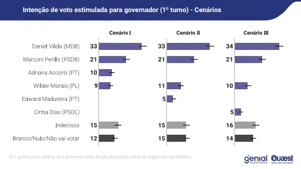 Nos demais cenários de 1º turno, Daniel Vilela mantém a liderança. No cenário 2, ele aparece com 33% das intenções de voto, seguido por Marconi Perillo, com 21%, Wilder Morais com 11% e o vereador Edward Madureira (PT) com 5%. Indecisos somam 15%, enquanto 15% afirmam votar em branco, nulo ou não comparecer. Já no terceiro cenário, Daniel sobe para 34%, com Marconi mantém os 21%, Wilder tem 10% e a professora Cíntia Dias (Psol) marca 5%. Nesse cenário, os indecisos são 16% e brancos, nulos ou ausentes 14%.