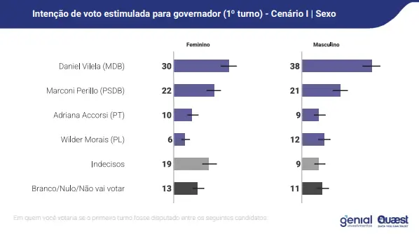 Em segundo, o ex-governador Marconi Perillo (PSDB) soma 21% das intenções de voto. A deputada federal Adriana Accorsi (PT) tem 10% e aparece numericamente à frente do senador Wilder Morais (PL), com 9%. Indecisos são 15%, e 12% dizem que votariam em branco, nulo ou não compareceriam. Em agosto, Marconi tinha 22%, Wilder 10% e Adriana, 8%. Em oito meses, o ex-governador e senador perderam 1 ponto cada.