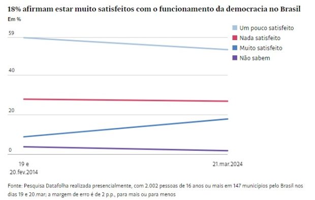 Segundo uma pesquisa realizada pelo Datafolha nos dias 19 e 20 de março, 71% dos brasileiros consideram a democracia como a melhor forma possível de governo. No entanto, apenas 7% acreditam que em certas circunstâncias uma ditadura seria preferível. Por outro lado, 18% dos entrevistados afirmam que tanto faz se o país vive sob o regime democrático ou não. Apesar da preferência pela democracia, a pesquisa revela que muitos brasileiros estão insatisfeitos com o atual sistema, classificando-o como problemático.