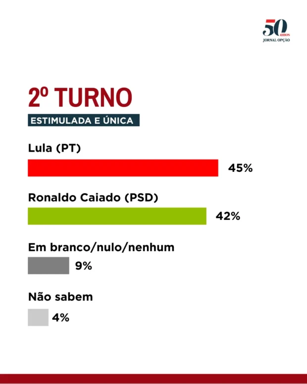 Na simulação, Lula registra 45% das intenções de voto, enquanto Caiado soma 42%. A diferença está dentro da margem de erro de dois pontos percentuais, o que caracteriza empate técnico.