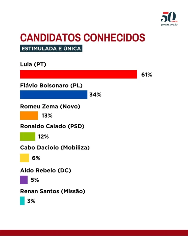 Zema aparece com 17% de rejeição e ainda é desconhecido por 56% dos entrevistados. Já Caiado tem 16% de rejeição, enquanto 54% dizem não saber quem ele é.