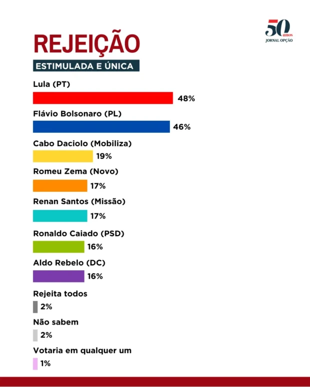Na sequência, aparece o governador de Minas Gerais, Romeu Zema, com 17%. Já os maiores índices de rejeição são registrados pelo presidente Luiz Inácio Lula da Silva, com 48%, e pelo senador Flávio Bolsonaro, que soma 46%.